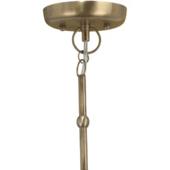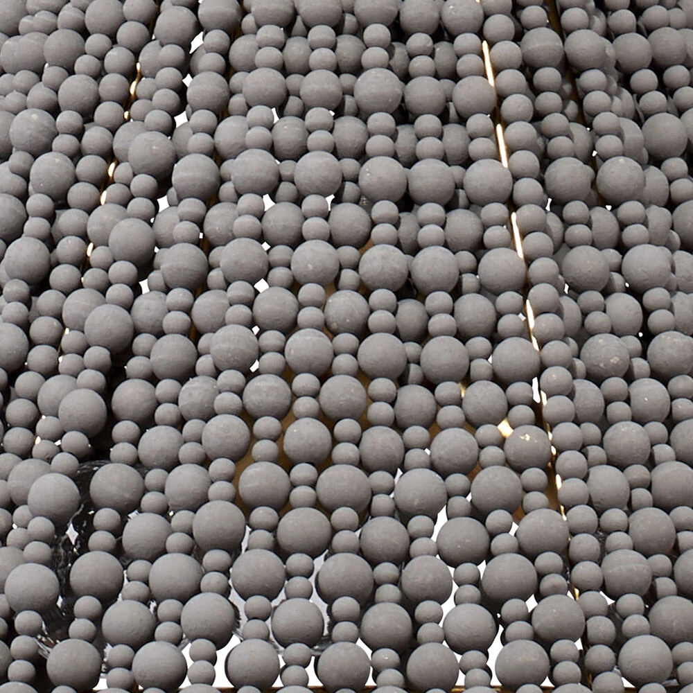 Cascading strands of carved wood beads flow gracefully and abundantly to create the “shade” in this astonishingly lovely chandelier. The antique grey beads create a vibrant, effervescent curtain that softly diffuses the light. As the beads are carved from natural wood, the finish and striations on each will vary slightly. The frame and metal accents are iron with a brightly contrasting burnished gold finish. A unique blend of vintage and modern, this intriguing piece was designed to be easily integrated into a multitude of décor styles. The fixture is suspended from a coordinating eight-foot chain in gold, and professional installation is recommended.