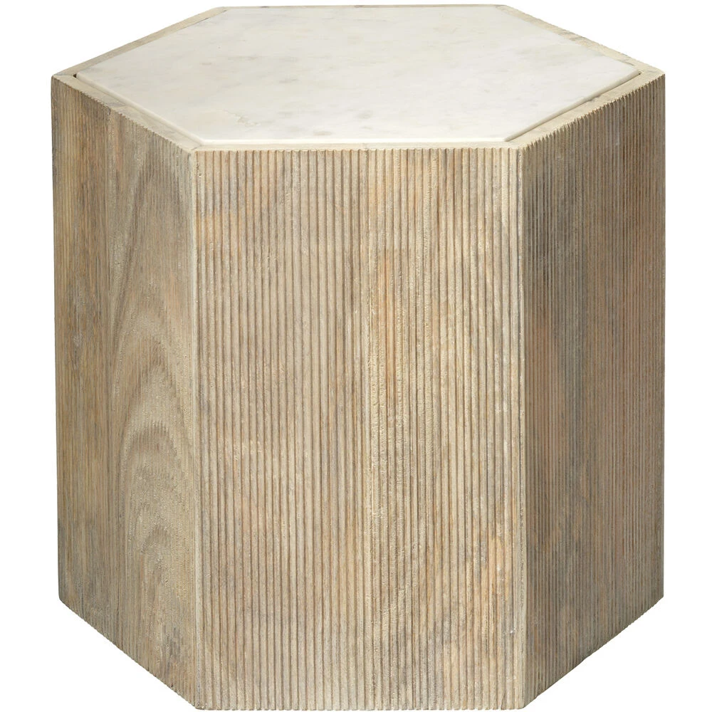 Simple, yet stunning our Argan Hexagon tables use a ribbed washed wood and white marble to create a brilliant side table that is light in feeling but large in size, perfect for any airy living room.Size of marble top will vary slightly. Marble is a natural stone with naturally occurring veining, colors and patterns, each piece is unique. Finish will vary. Minor assembly required.