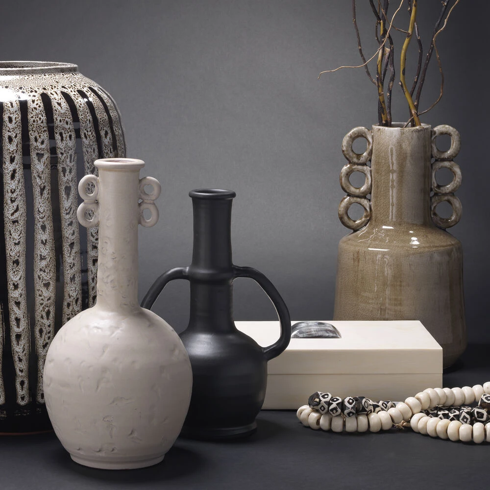 Inspired by the earthy elements of traditional ceramic pottery, this vase features an elongated neck and geometric accents for visual interest. Its neutral tones make it a go-to for all seasons as you swap out dried florals. Display in singles or in multiples for a stricking presentation.