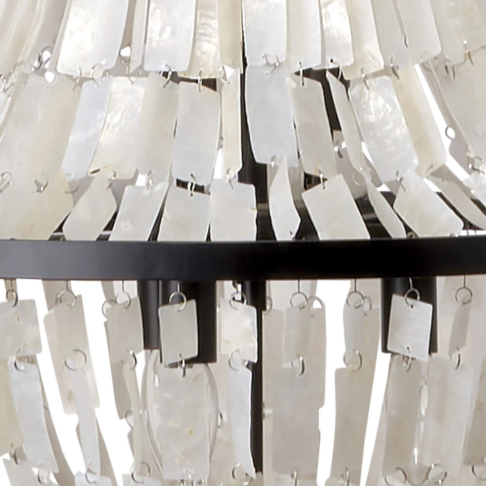 Mother of Pearl is the iridescent substance found inside some shells. Dozens of small paillettes of this stunning natural material are hand cut and strung to create this radiant chandelier. No two pieces are ever identical. The strong iron frame that holds this delicate masterpiece together is finished in a deep oil rubbed bronze, as is its eight-foot chain. Magical and captivating, this fixture adds light, luminescence, and the beauty of the beach to any room it is hung in. Some assembly, and profession installation, is required.
