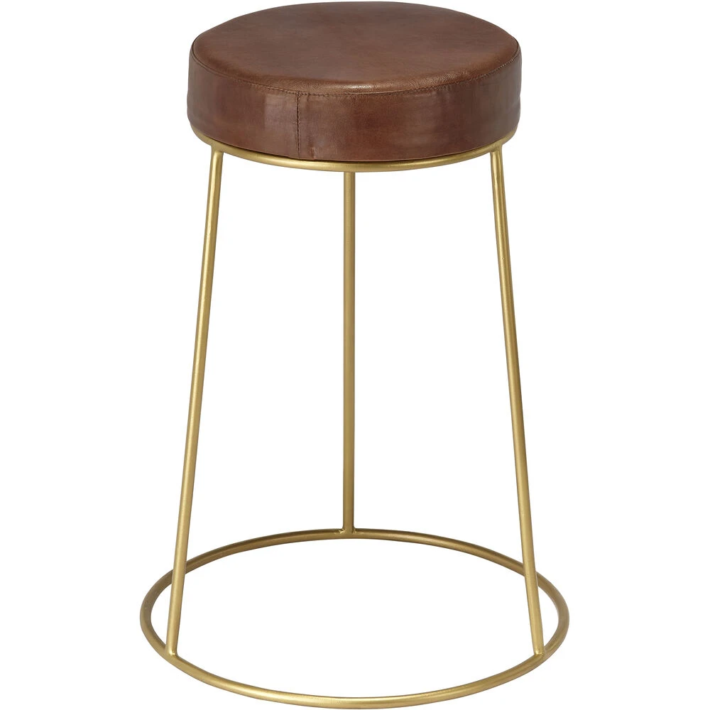 These unique stools are available in bar or counter height. Each features a comfortably padded round seat in top-quality matte brown leather that tops an asymmetrical tri-legged base in a modern metallic finish. The contrast between the sleek, slim brass base and the substantial seat is elegant and unexpected, and results in the perfect perch for home bar or kitchen counter!