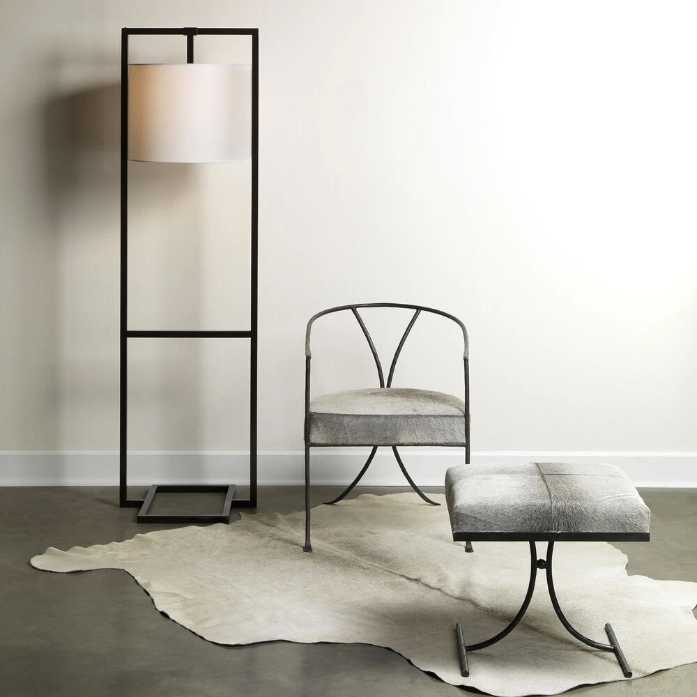 The Kai collection features dynamically swooped hand-forged iron legs, with a delicacy unexpected from such a substantial material. The seating is topped with thick cushions of grey hair-on-hide, and the tables with strong tempered glass. Unexpectedly combining grace and strength, they make a striking addition an industrial, rustic, or eclectic home.
