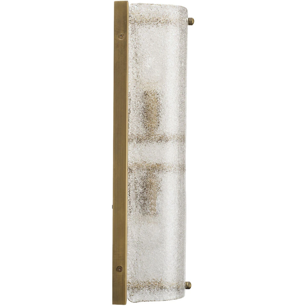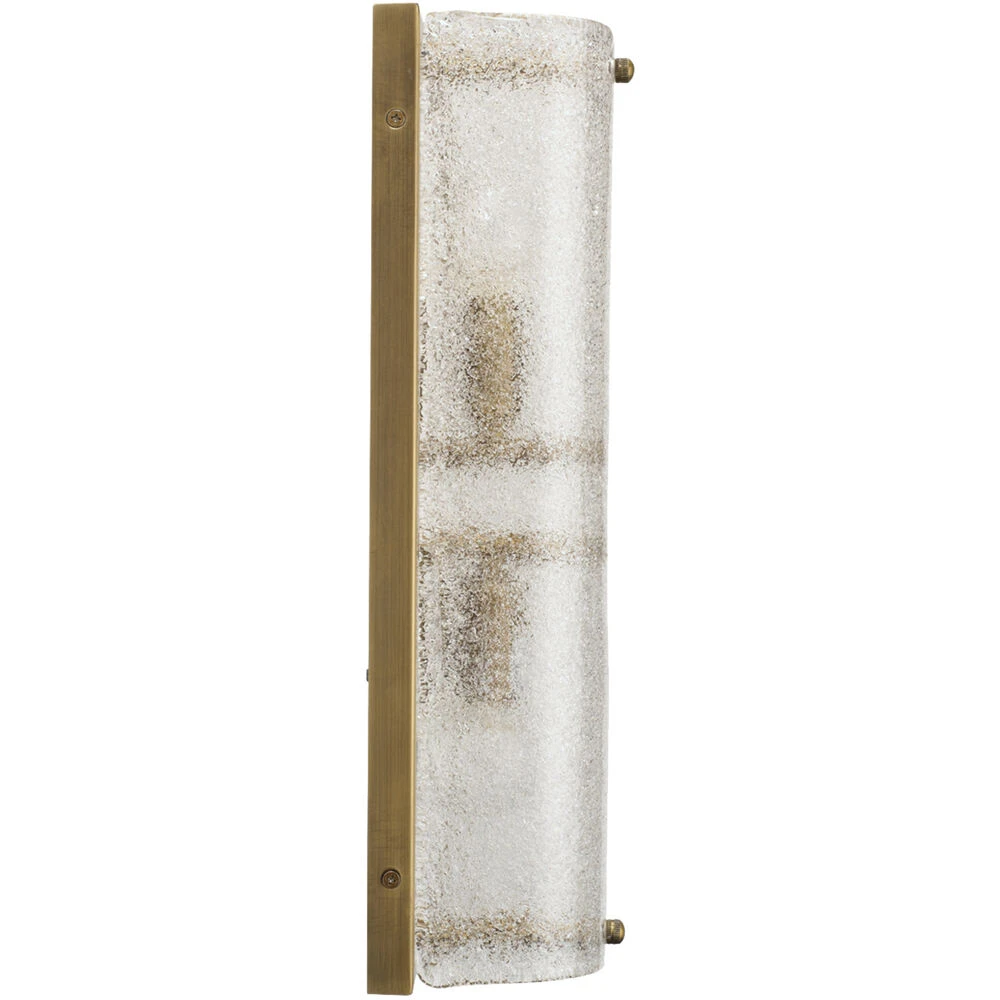 This clear decorative glass treatment feels like melted ice against an antique brass back plate. We have two sizes in this wall sconce. They can be placed in any room in the house, and hang vertically or horizontally.