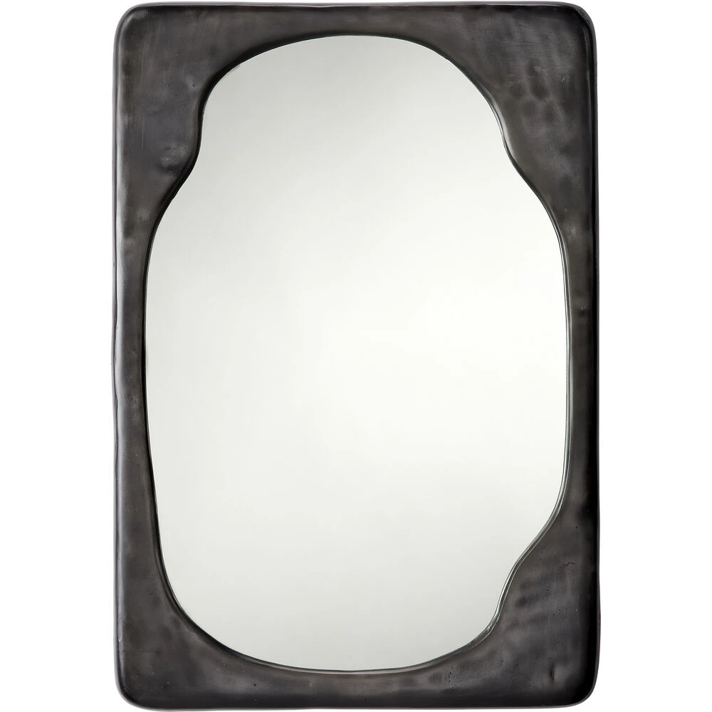 Undeniably organic in nature, the free-flowing lines of this wall mirror stoke memories of rain on city streets and of the unique shapes formed from flowing drops of molten metal. Each is expertly artisan crafted of iron with an antiqued silver finish. Bold, beautiful, and very modern, the rectangular mirror can be hung horizontally or vertically and can anchor an entire room.