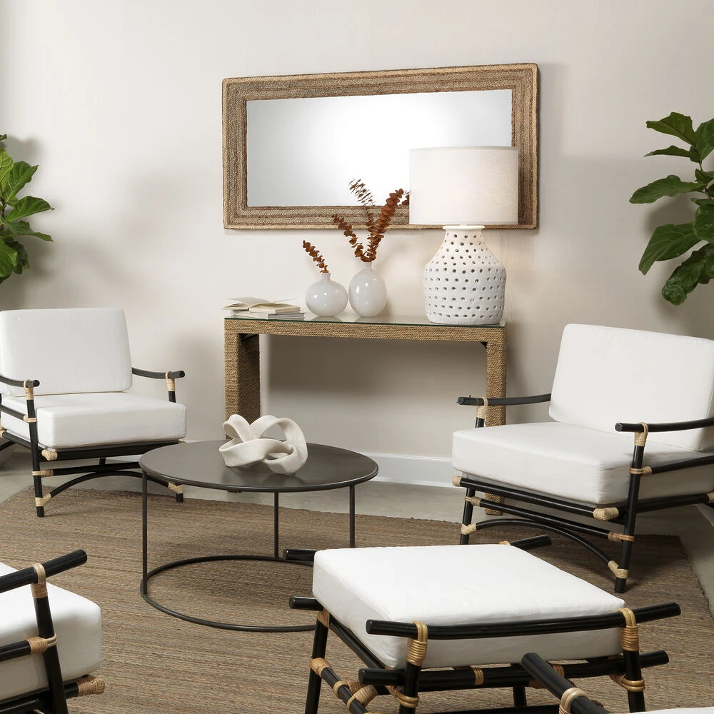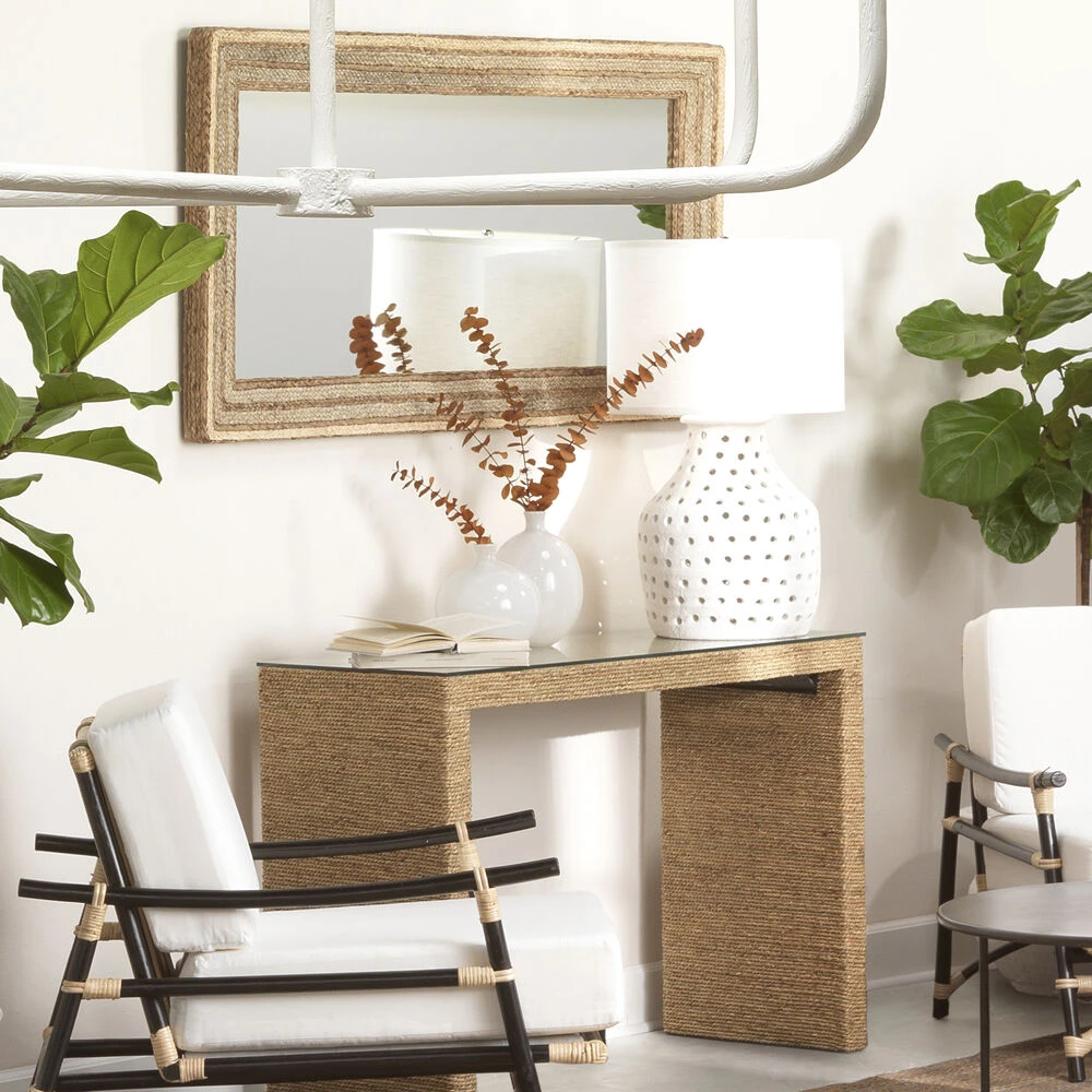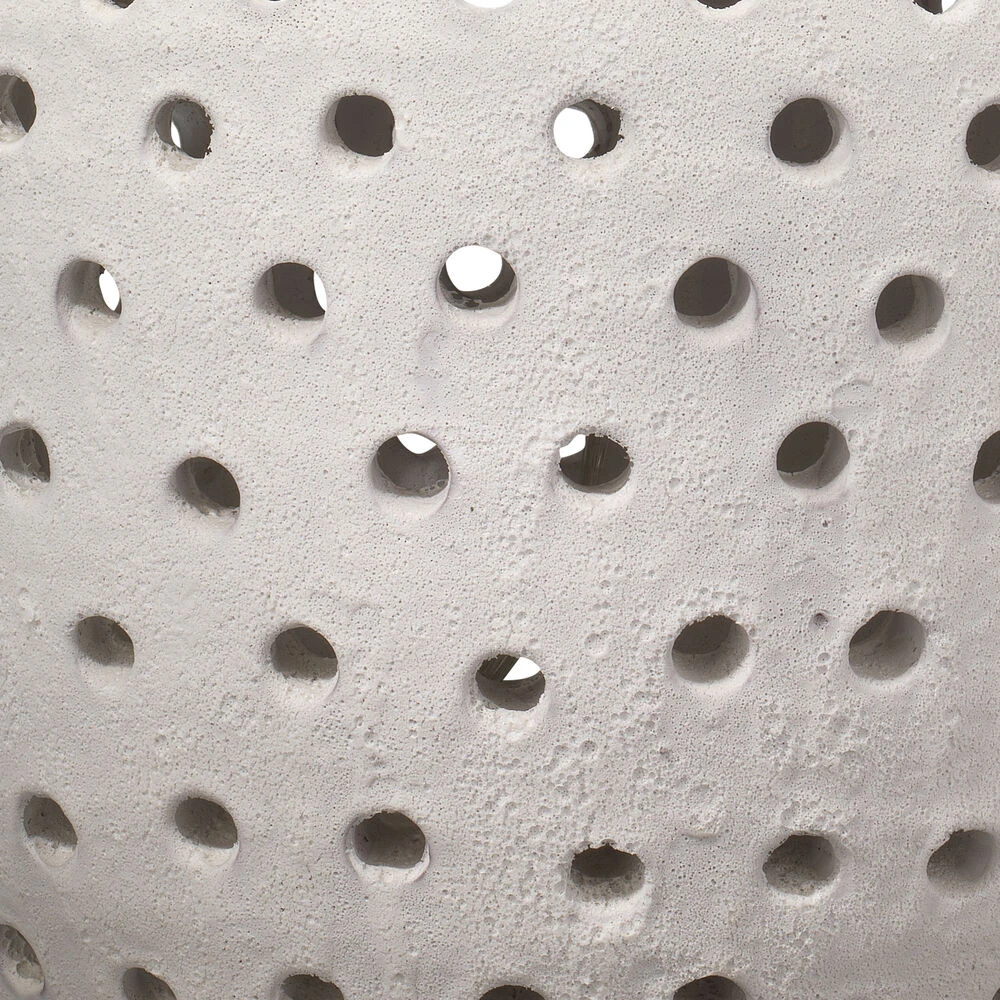 The uncommon pierced, soft organic ceramic base of this table lamp has a sophisticated rustic matte white textured glaze.