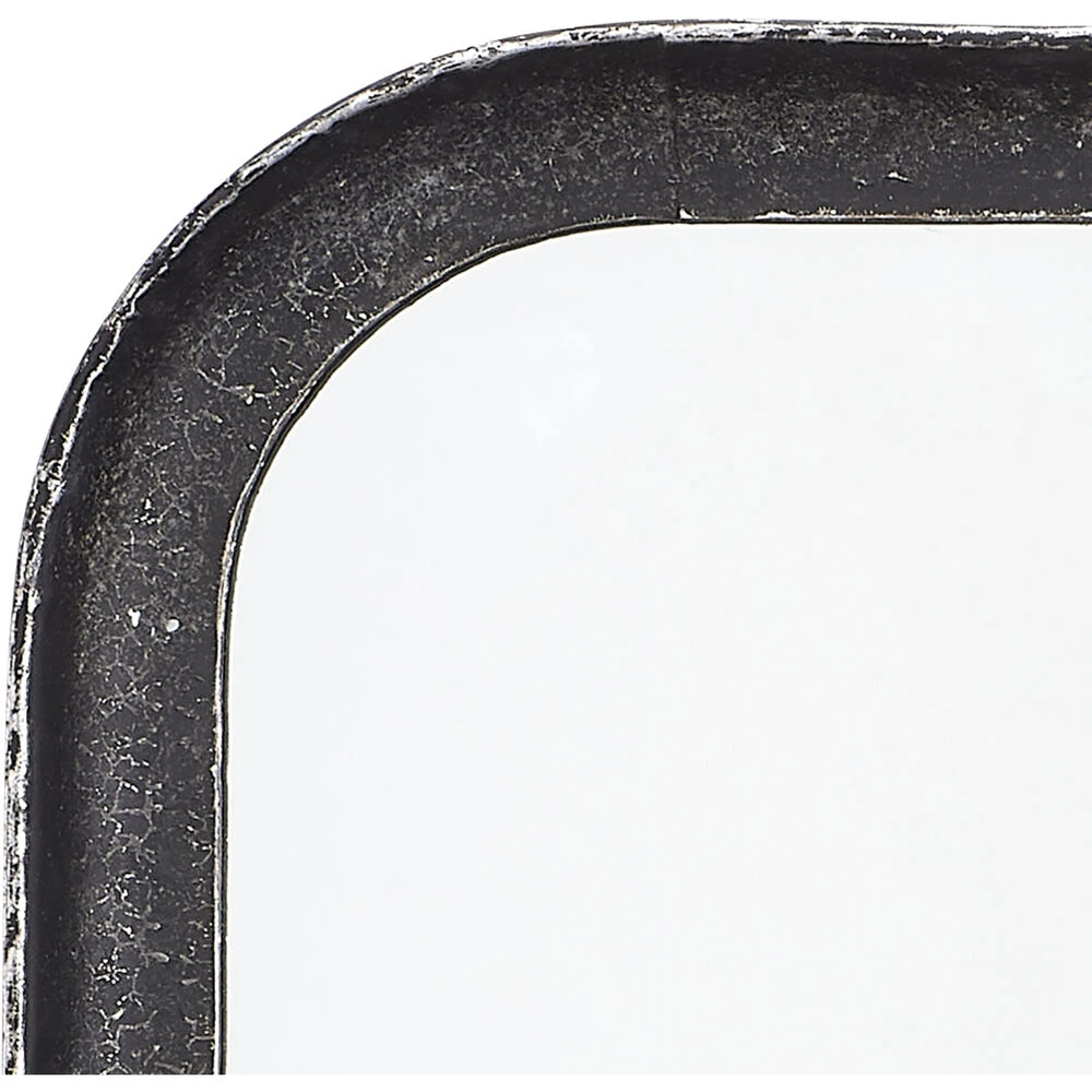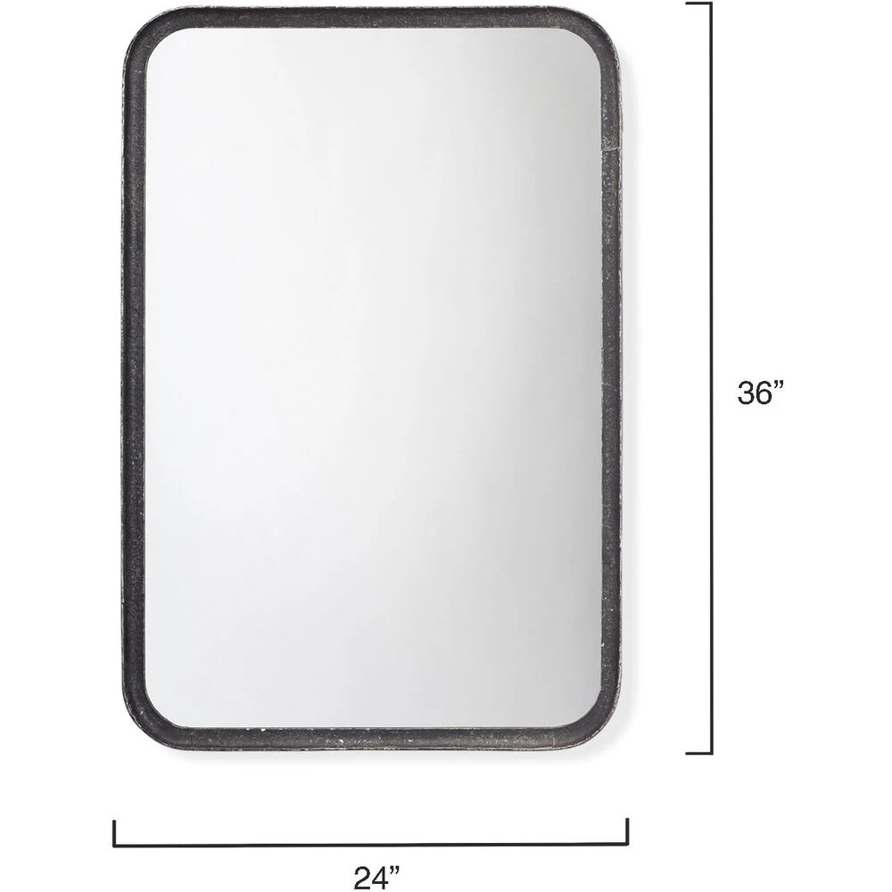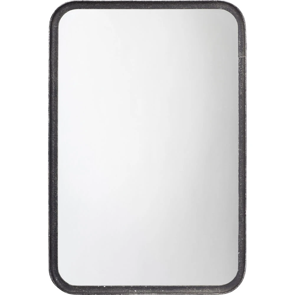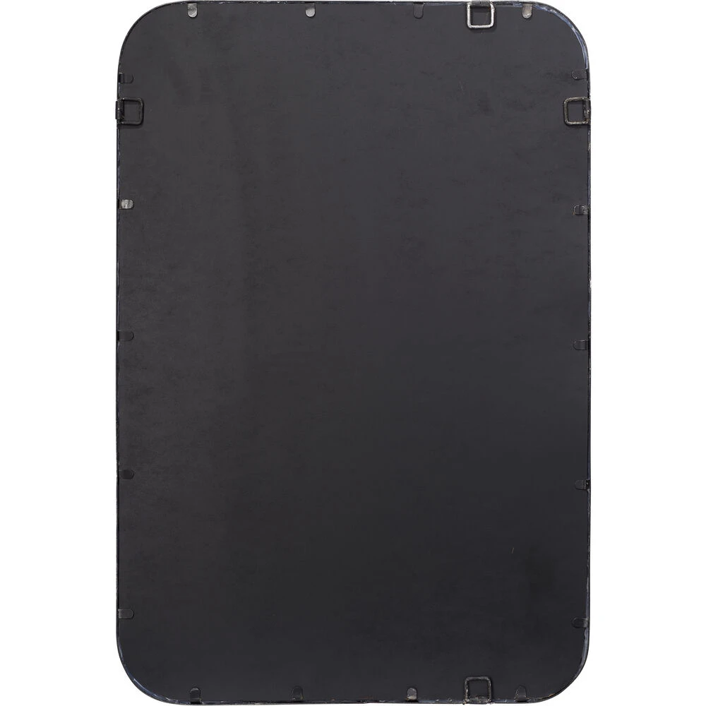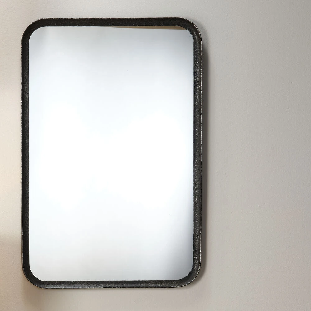 The clean lines of this contemporary wall mirror’s frame are forged of hand-distressed black metal. Featuring gently rounded corners that soften the starkness of the design without distracting and the versatility of hanging horizontally and vertically. Mounted above a vanity, sideboard or dresser, this mirror will open-up your view and make your space feel bigger.