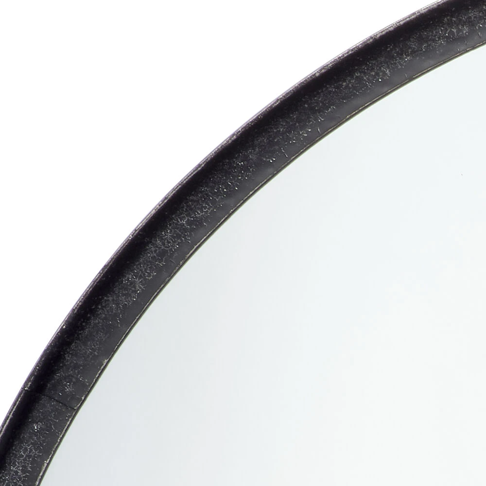 The clean lines of this contemporary wall mirror’s frame are forged of hand-distressed black metal. Featuring gently rounded corners that soften the starkness of the design without distracting and the versatility of hanging horizontally and vertically. Mounted above a vanity, sideboard or dresser, its round shape will soften any room while reflecting light to make your space feel bigger.