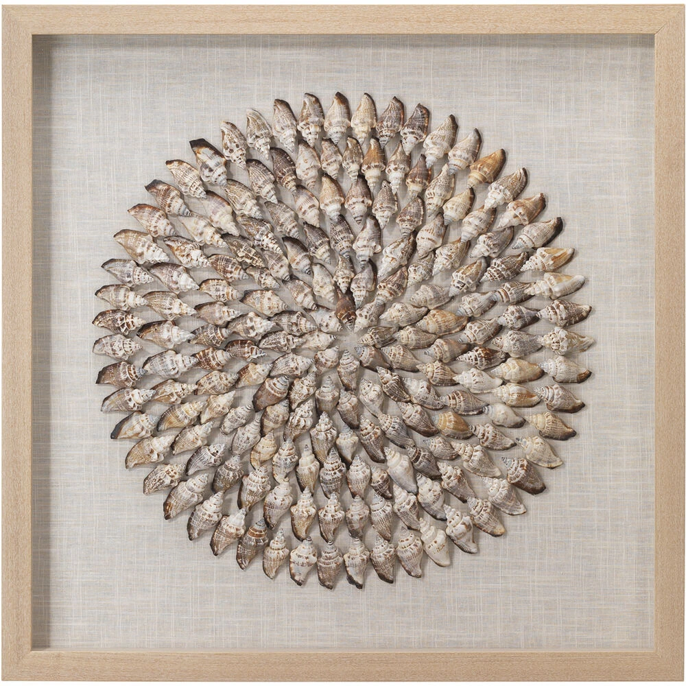 A revolving pattern of unique shell shapes create a circular pattern of organic beauty. Natural colors and textures of radiate outward while drawing you into this stunner from the sea. As if this wall art piece washed ashore, specifically for your wall.