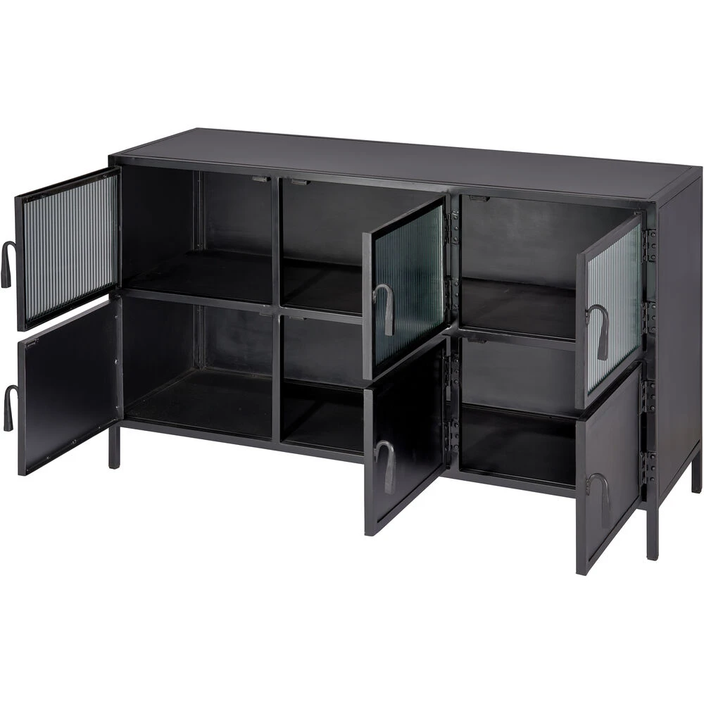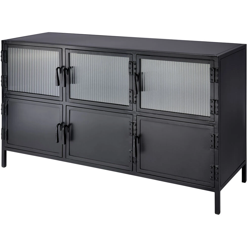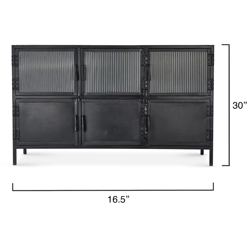 With an abundance of storage and tons of style, this industrial edged console is ideal for an urban, contemporary décor. Handcrafted of minimally finished black metal, its six doors open to reveal ample cupboard space and one fixed shelf. Three of the doors are in a richly textural ribbed glass. The bottom three are solid metal. All six open easily with hand-forged iron pulls.