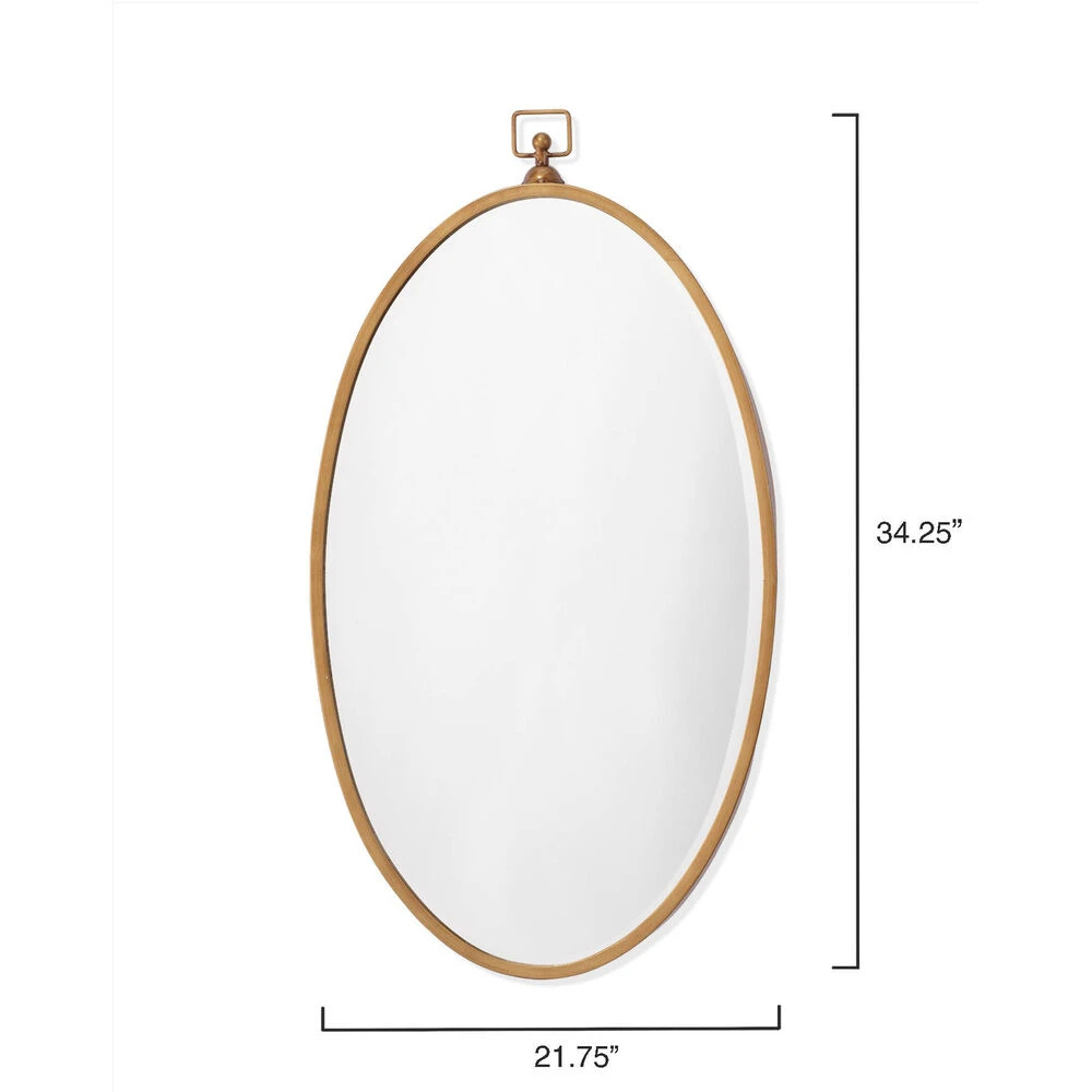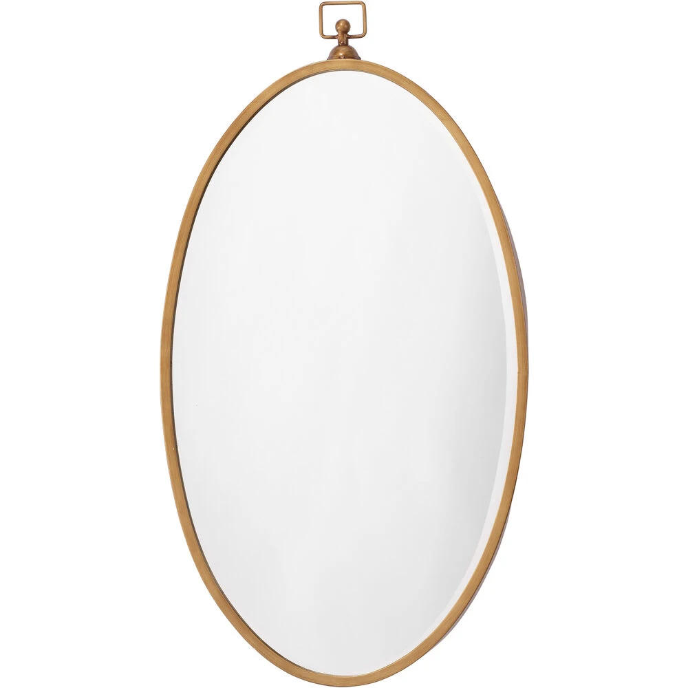A modern take on an antique-inspired silhouette, this mirror will bring charm to a variety of décor styles. Featuring glass surrounded by a slim metal frame hand-finished in antique brass and the versatility of hanging horizontally and vertically. Mounted above a vanity, sideboard or dresser, its oval shape will soften any room while reflecting light to make your space feel bigger.