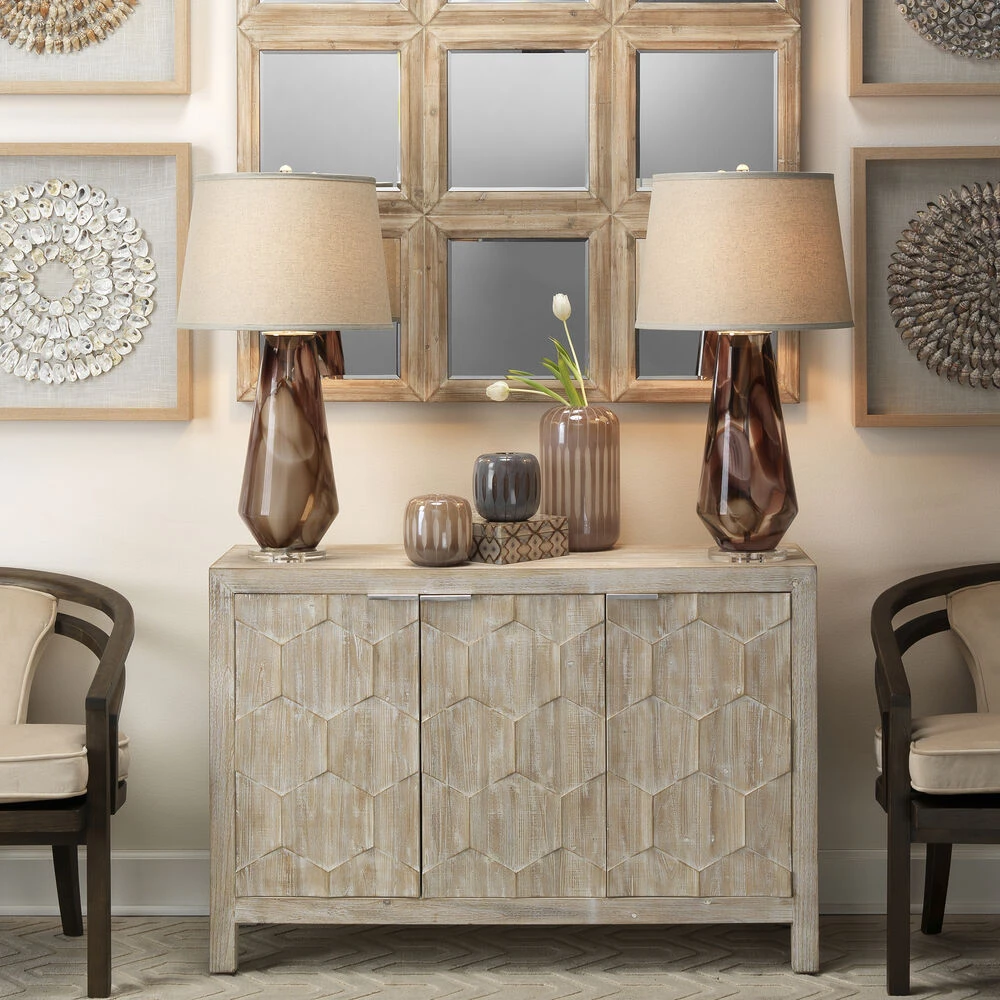 This mouth blown glass lamp was inspired by watercolors of the 70’s with beautiful plums and soft browns. This soft, warm lamp can go with both silver and brass accents in any room.